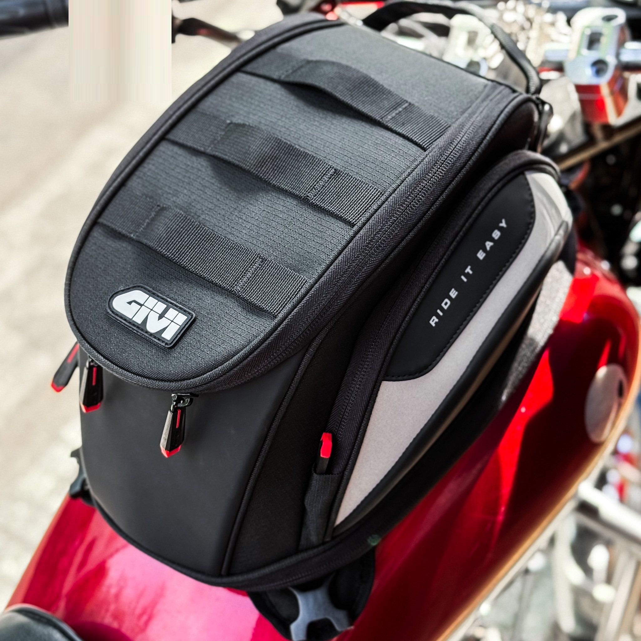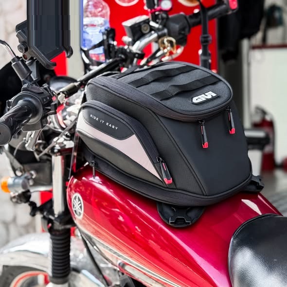 Đối với các xe có bình xăng nhựa, Givi trang bị thêm dây đai gài nhanh, có thể cố định túi bằng móc cài – tiện lợi và gọn gàng.